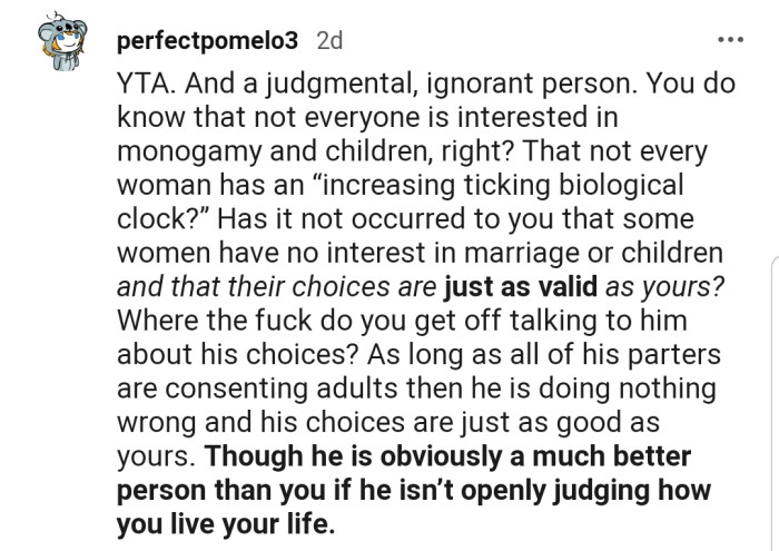 "YTA. And a judgmental, ignorant person. You do know that not everyone is interested in monogamy and children, right?"