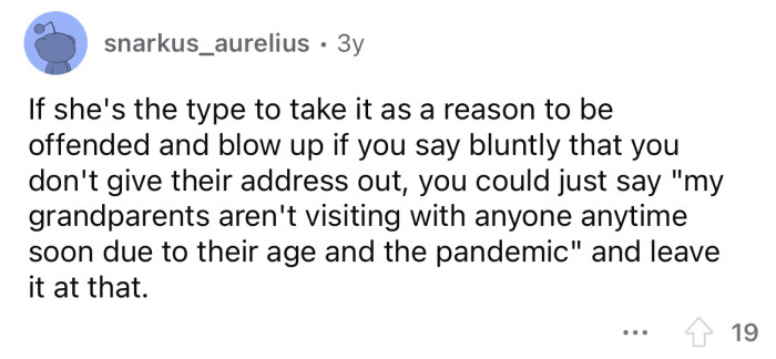 Now the OP and her husband don't know what to tell her because they don't want her showing up unannounced and causing problems. But if the OP doesn't give her the address, she will hold it against her and call her "controlling."