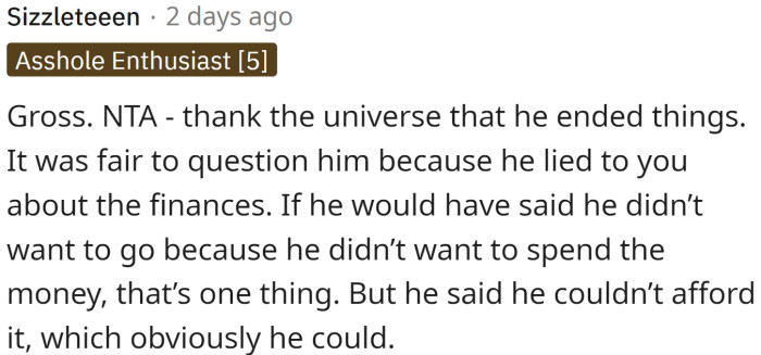 OP questioned how he could afford these purchases when he had previously claimed to have no money, and he became furious, accusing her of being controlling.