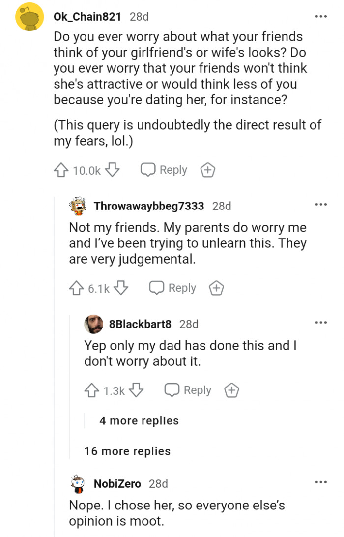 "Do you ever worry about what your friends think of your girlfriend's or wife's looks?"