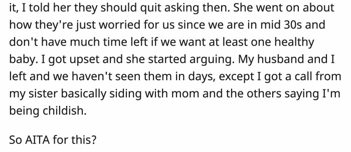 OP replied that they should stop asking her that question then. Her mom tried to justify it by saying everyone was just worried about OP not being able to get pregnant due to her age.
