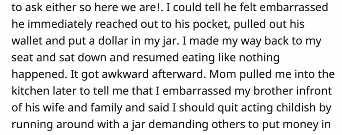 They were all watching them when the brother said he didn't have to pay OP anything, and she replied that he also didn't have to ask that question, but here they are. OP could see that her brother was embarrassed, but he donated a dollar anyway.