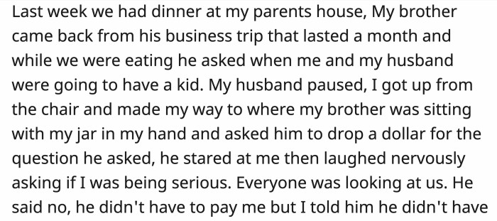 During the dinner, the unwitting brother asked OP when she and her husband were planning to have kids. OP's husband paused while OP stood up, holding the pregnancy jar, and made a beeline for her brother.