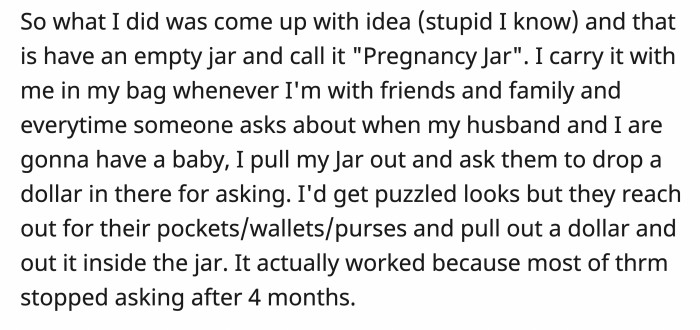They caught on to the purpose of the jar after a while. For four blissful months, their friends and family stopped asking OP anything related to her childbearing prowess.