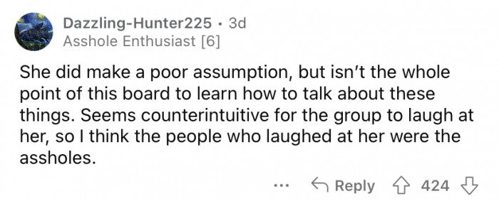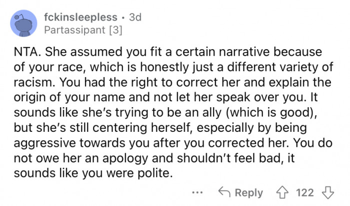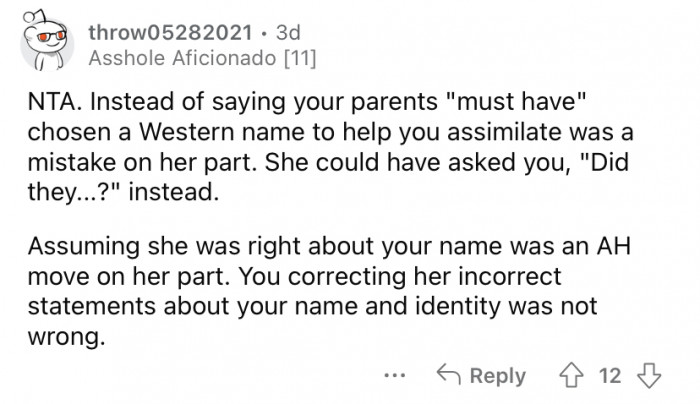 The Redditor spoke up to clarify that she has an American-sounding name, not because her parents were trying to conform to white culture, but because they are Christians who often use Biblical names and always have. When the OP finished, the group started to laugh, which embarrassed the other student, who awkwardly apologized to OP for her assumption.