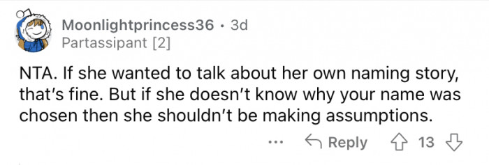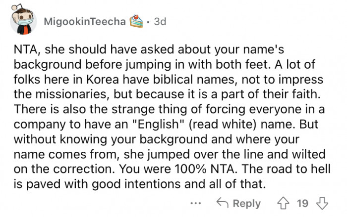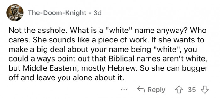 Later, the Reddit user edited her original post, stating that she had received many replies from people who were making further assumptions about the history of her name. The OP schooled the Reddit community, saying, "The arrogance and irony of some of you is laughable."