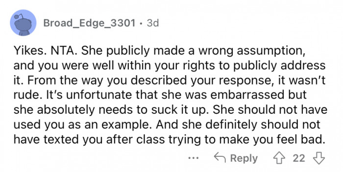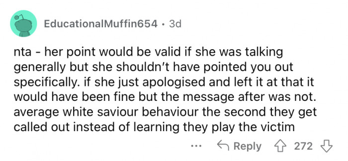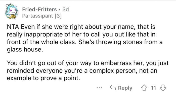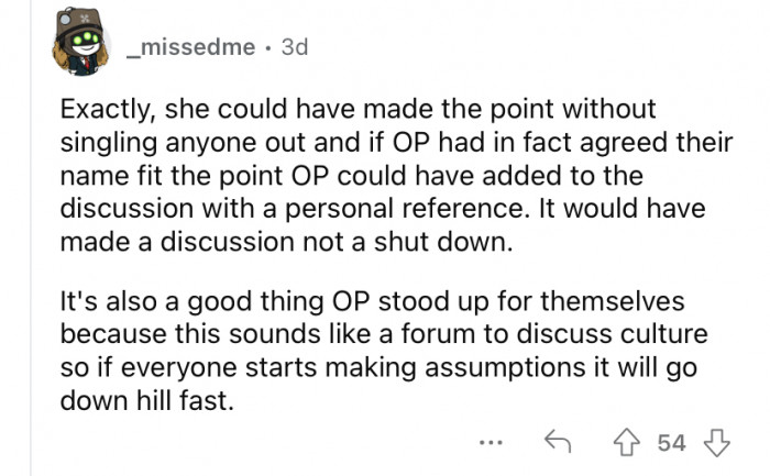 Afterward, the student texted OP, saying she felt humiliated in front of the group and now feels discouraged from speaking up again. The Redditor explained that it wasn't her intention to make the student feel that way, but that she shouldn't have made such assumptions about her family and her name.
