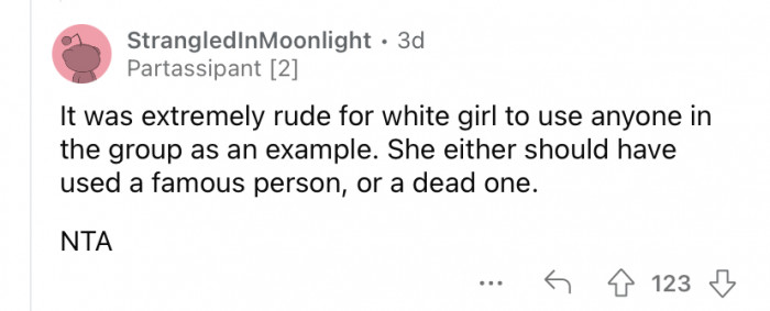 Either way, it's a valuable life lesson for the girl to learn. Making assumptions about someone's culture is never okay, especially in a public setting.