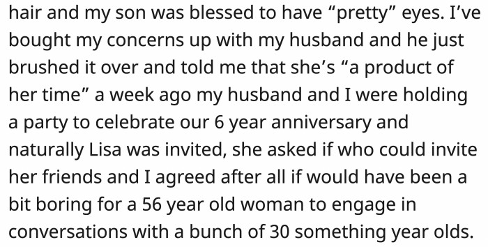 They held a party and, of course, invited Lisa, who asked if she could also invite some of her friends. OP readily agreed to Lisa's request because she didn't want her to feel out of place at a party with younger people.