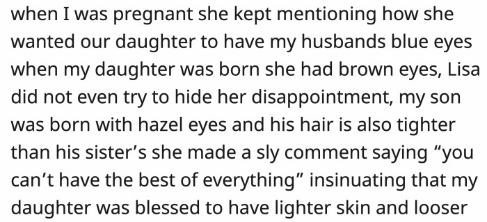 Next, when OP's son was born with hazel eyes and tight curls, Lisa also had something to say about that. She said, "You can't have the best of everything," implying that OP's daughter is blessed to have light skin and looser curls while her son is lucky to have "pretty eyes."