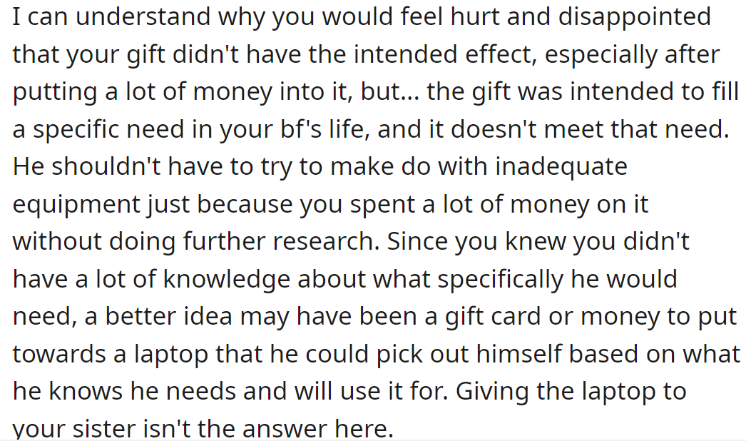Redditors saw that the OP didn't understand why her boyfriend was disappointed with the laptop specifications, so they tried to explain it to her. They also told her she should have returned it as her boyfriend asked, rather than re-gifting it to another person.
