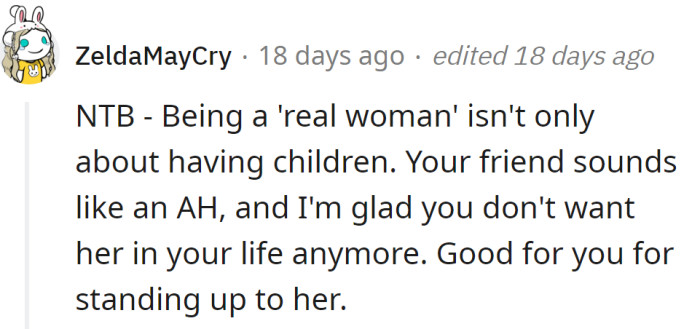 The Redditor's friend's comment reflects societal misconceptions about womanhood and fertility, highlighting the need for greater awareness and sensitivity.