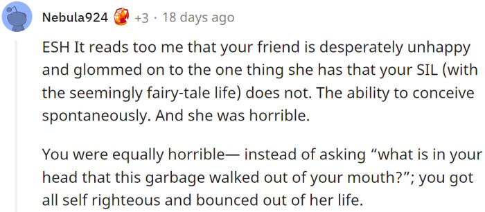 redditOn the other hand, her SIL has triplets conceived with IVF, to which her best friend made a very rude comment.