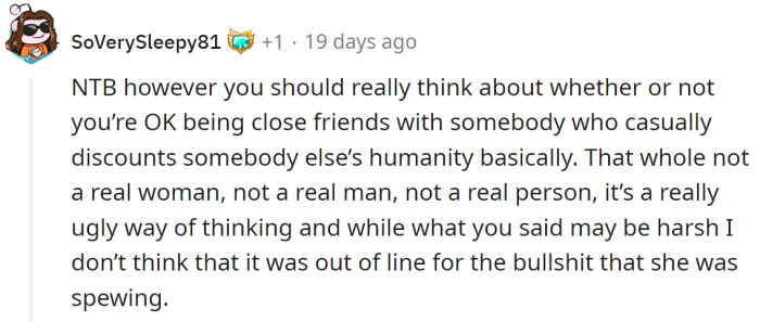 Feeling offended on the SIL's behalf, the OP defended her, stating that she is indeed a "real woman," highlighting that her children were intentionally planned and have a caring father. The friend responded by bursting into tears and walking away, leading to a week-long silence between them.