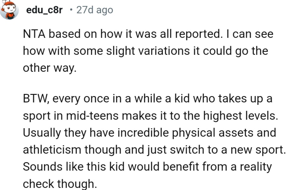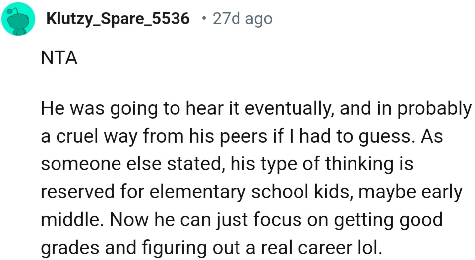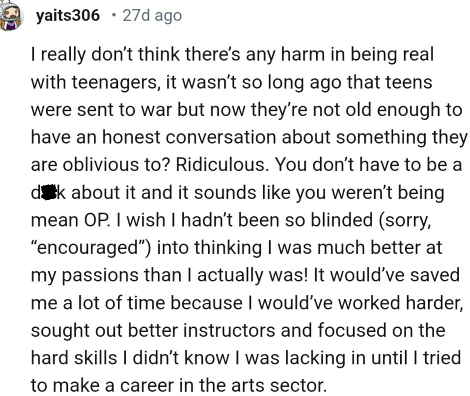 "Sounds like this kid would benefit from a reality check though"