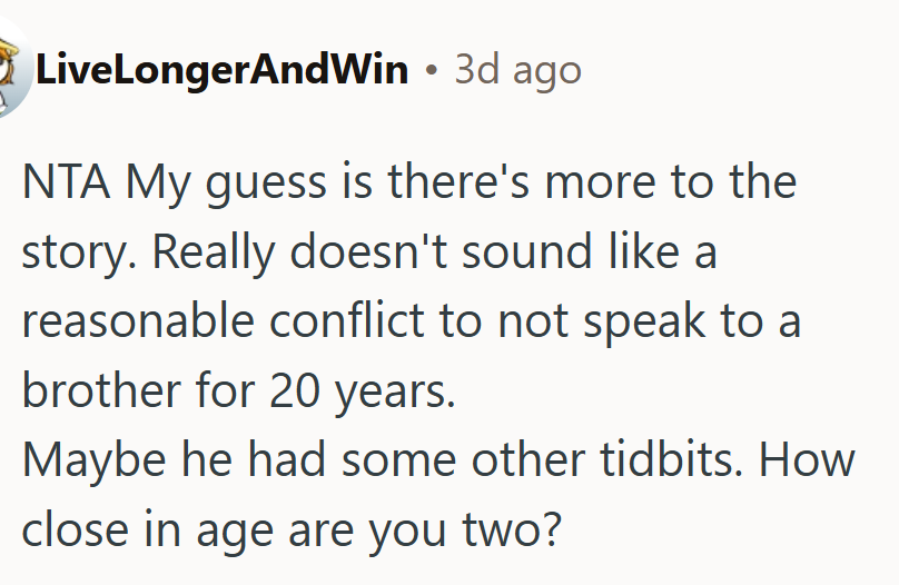Caught off guard, the poster explained what he had always been told: years ago, his dad had dated the woman who would later become his uncle’s wife. When his brother pursued her after their breakup, his father felt betrayed, and their relationship fractured.