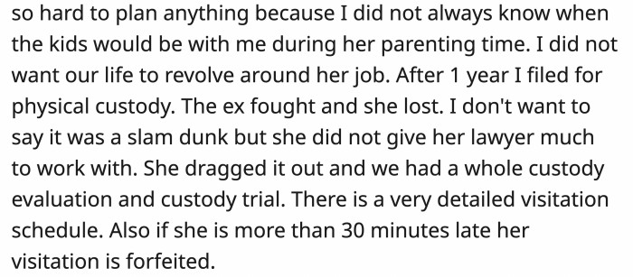 His ex tried to prolong the custody evaluation and trial, but it ultimately did not work in her favor due to her lawyer not having much to work with. Now she needs to adhere to a detailed schedule, and after abusing OP’s flexibility with it, OP had her follow it precisely.