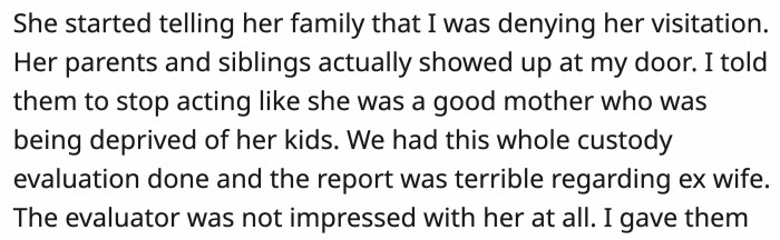 OP’s ex’s parents and siblings showed up at his door, accusing him of denying visitations. OP had them read the evaluation by the custody evaluator and asked them to leave.
