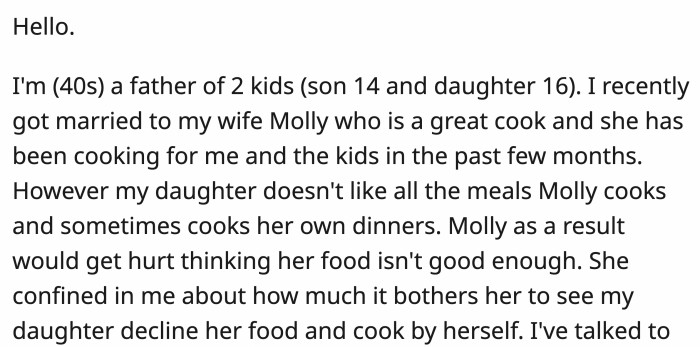 OP's teenage daughter preferred to cook for herself rather than eat whatever the stepmom made without disclosing what kind of food she cooks. Apparently, OP sided with the stepmom after he found them fighting over that issue.