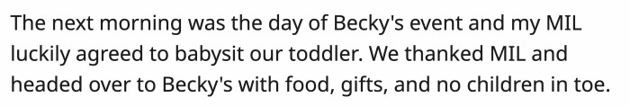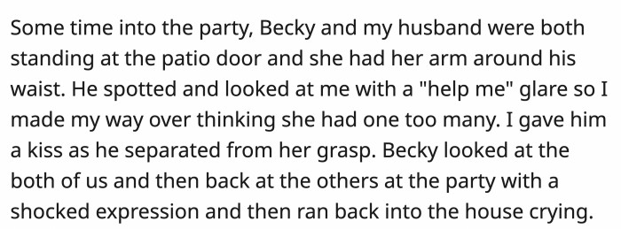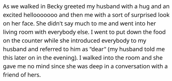 Fast forward to the time when OP had her mother-in-law take care of their child, allowing her to attend the event with her husband. Once they arrived, Becky was shocked to see OP but nevertheless led her husband away to be introduced and accompanied him throughout.