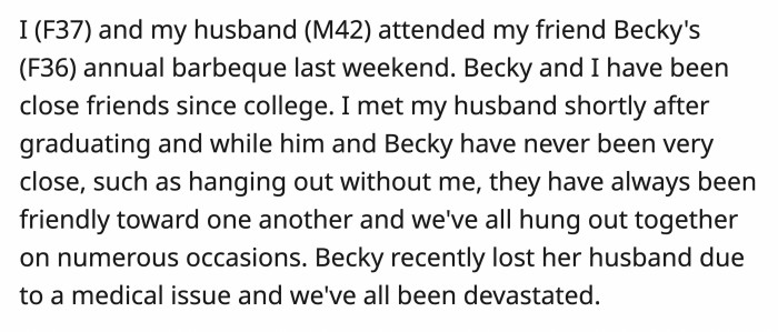 OP stated that she wouldn't be able to go, and Becky understood but was still excited to see her husband, which was suspicious considering OP's husband and Becky weren't really close friends.