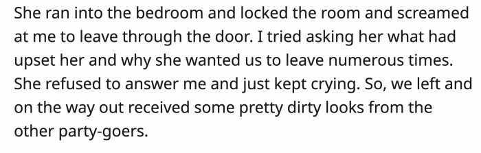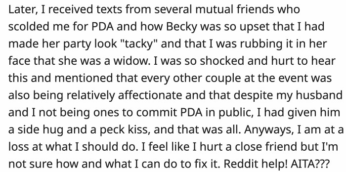 OP and her husband were both taken aback as she ran away upset, and they were further dumbfounded as people gave her dirty looks. Becky told her to leave, and when they did, messages from friends reached OP, telling her how their PDA was inappropriate.
