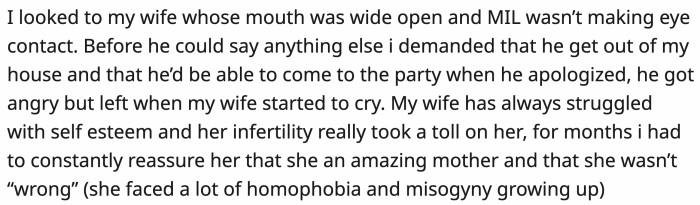 Before her BIL could say anything else, OP kicked him out of the house. She told him that he could come to the party if he apologized, but he got mad at OP and left when he saw his sister (OP's wife) cry.