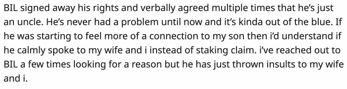 The brother-in-law could be having problems reconciling the idea of being someone's biological father but not being a parent to the said child