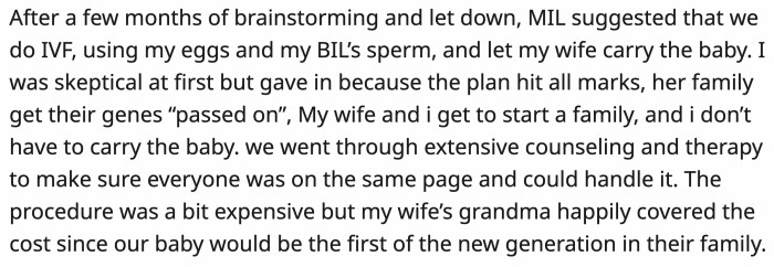 It's a lot to digest, we know, but stay with us. They were at a dead end until her wife's mom suggested that the couple try IVF. Her mother-in-law (MIL) said that they should use OP's eggs and BIL's (brother-in-law's) sperm.