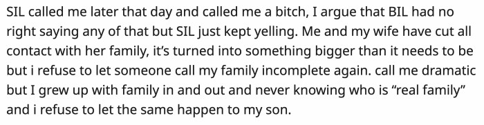 Since then, OP and her wife have stopped communicating with her wife's side of the family. Her wife is sad about what happened, but they both agree that they shouldn't be around people who think their family is incomplete.