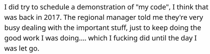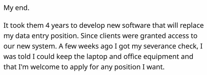 But this good thing that OP hoped would go on for decades eventually got pulled from under him when, five years later, new technology was implemented by the company that made his position irrelevant.