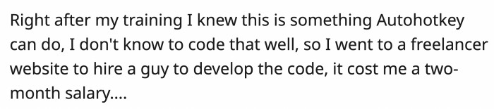 OP shared that he was hired for the job and trained for it when he got the idea that it was something that could be fully automated with software. The thing is, OP wasn't well-versed in coding and decided to hire someone once to set it up before trying it out.
