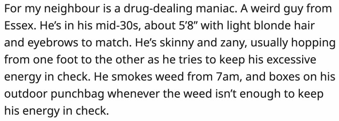 The new neighbor is a 5-foot-8 blond guy in his mid-30s, who also happens to be a drug dealer. The fact that the neighbor is in the illicit substance business didn't bother OP as much since he enjoys the occasional weed, and they harmoniously coexisted.