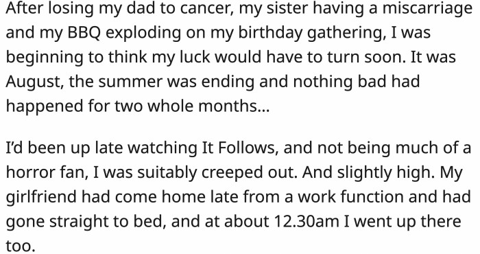 Our OP's (original poster) year didn't exactly start great. He lost his father to cancer, his sister had a miscarriage, and his birthday party involved an exploding barbecue. All bad things come in threes, right?
