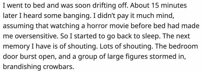 He was about to fall asleep when he suddenly heard a loud banging in his house. OP brushed it off, thinking it was just him being paranoid.