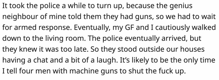 OP had enough and stayed behind the safety of his barricaded room along with his girlfriend. Eventually, the police showed up and took statements.