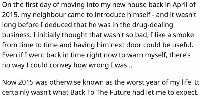 Two months after moving in without anything bad happening, OP fully believed his luck had changed. Until one night, as it turns out, living beside a drug dealer became a very obvious problem.