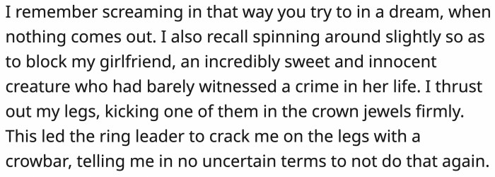 He also tried to shield his frightened girlfriend from possible harm. OP thrust his legs out and kicked one of the men in the groin, which earned him a hit with a crowbar on his legs.