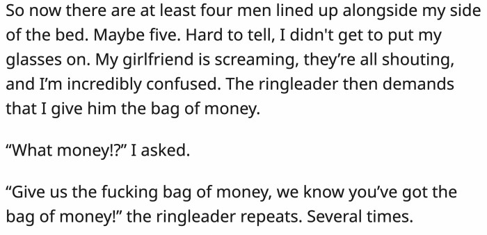 This inspired OP to negotiate with the ringleader standing in his bedroom, demanding a bag of money from OP.