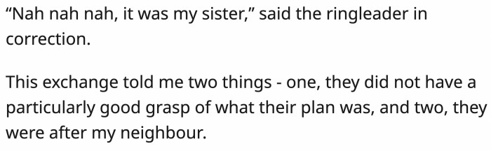 The ringleader realized that OP was not the person they were looking for and asked if they were terrorizing the right home.