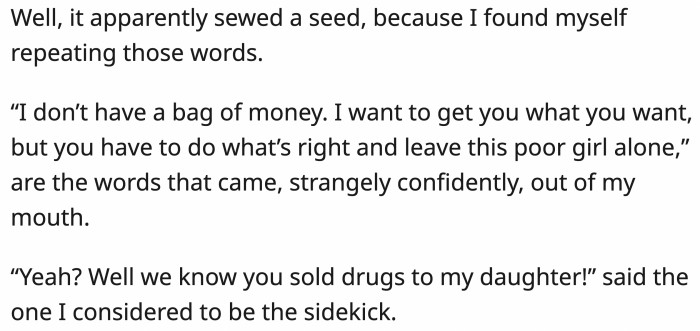 OP said, “I don’t have a bag of money. I want to get you what you want, but you have to do what’s right and leave this poor girl alone.” The thugs replied that OP had apparently sold drugs to their daughter.