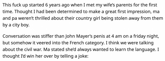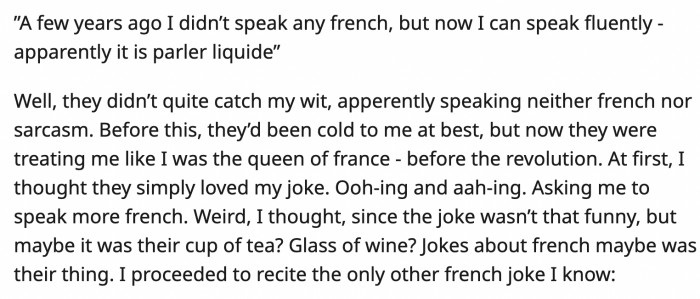 They were making a lot of small talk, but somehow the topic swayed to anything about France. Determined to break the tension, OP made a joke about speaking French.
