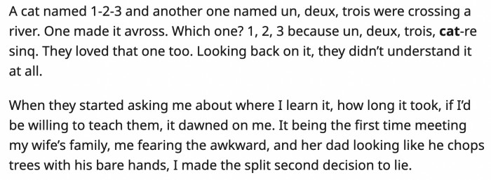 After the joke, his wife's parents began asking him a bunch of questions. They were curious about how long it took OP to learn, where he learned the language, and if he was willing to teach them.