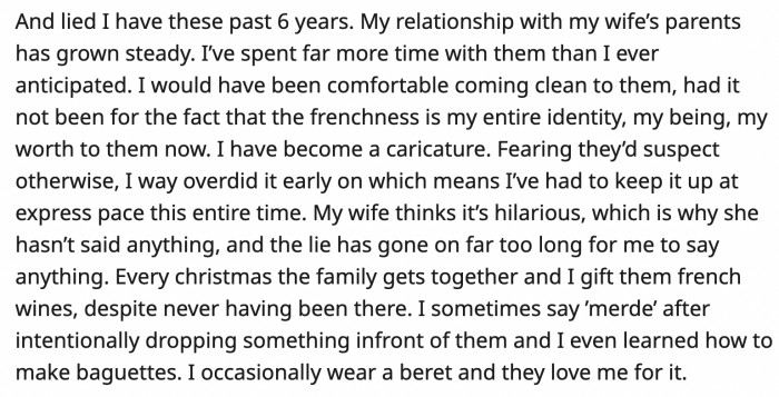 It finally dawned on OP that they actually believed he spoke French. But OP thought it was too late to turn back now, and he was scared of his wife's dad, so OP decided to lie.