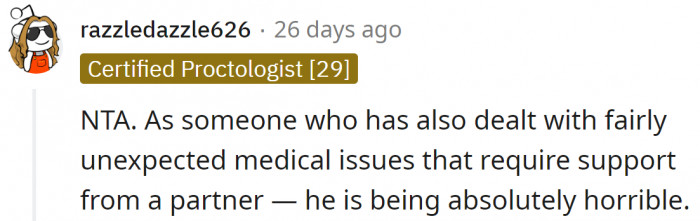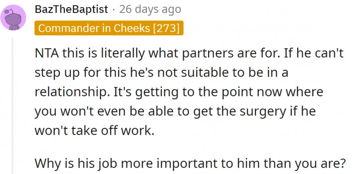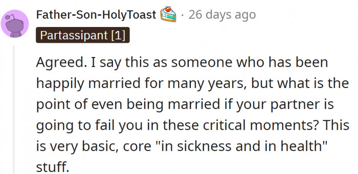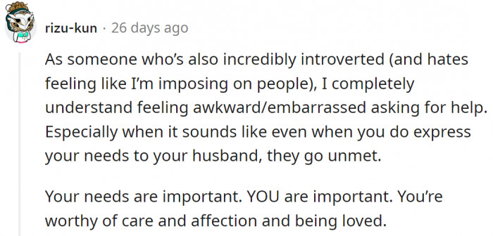 A Reddit user found herself in a similar situation. She needed help from her partner more than anything, but it seemed he hadn't quite understood the meaning of his role and presence during her tough times.