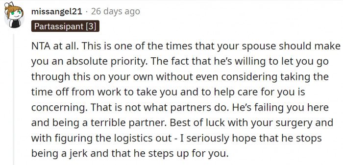 She was scheduled for surgery, so she needed someone to take her to the hospital and stay with her for the first 24 hours. Naturally, she explained everything to her husband, but he told her he couldn't take her to the hospital nor stay with her because he had to work.