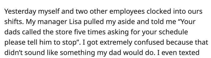 Here's what happened: OP works at a store where one person manages an entire section by themselves, as they are short-staffed. During one of her shifts, her manager pulled her aside and asked her to tell OP's dad to stop calling and asking for her schedule.