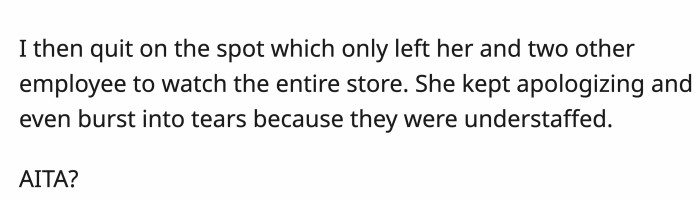 The manager seemed to have a wake-up call, and that's when she burst into tears, realizing that they were understaffed and would probably need to remedy the situation.