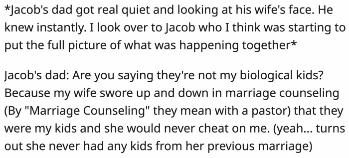 OP's knowledge of biology uncovered a family secret that the mom had been keeping for decades! Even after swearing in front of a pastor that she would never cheat on her husband, the mom did!