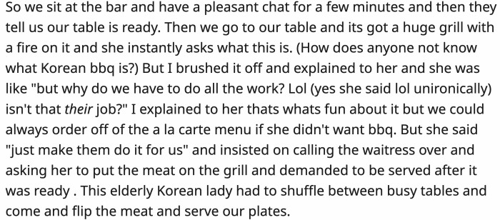 OP found that odd since their area has had a Korean barbecue place since the '90s. OP explained how the restaurant works, but then the date said, "But why do we have to do all the work? Isn't that their job?"